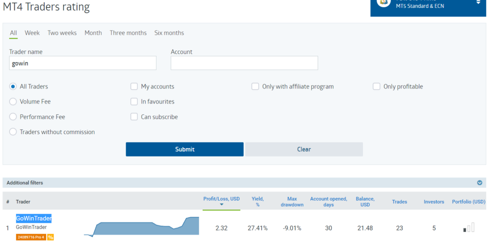 Ahora dentro de la clasificación de Trader MT4 debe buscar nuestro nombre (GoWinTrader) como aparece en el cuadro naranja: